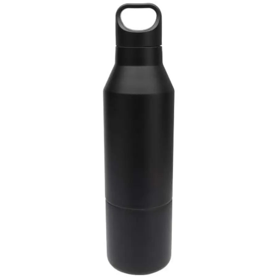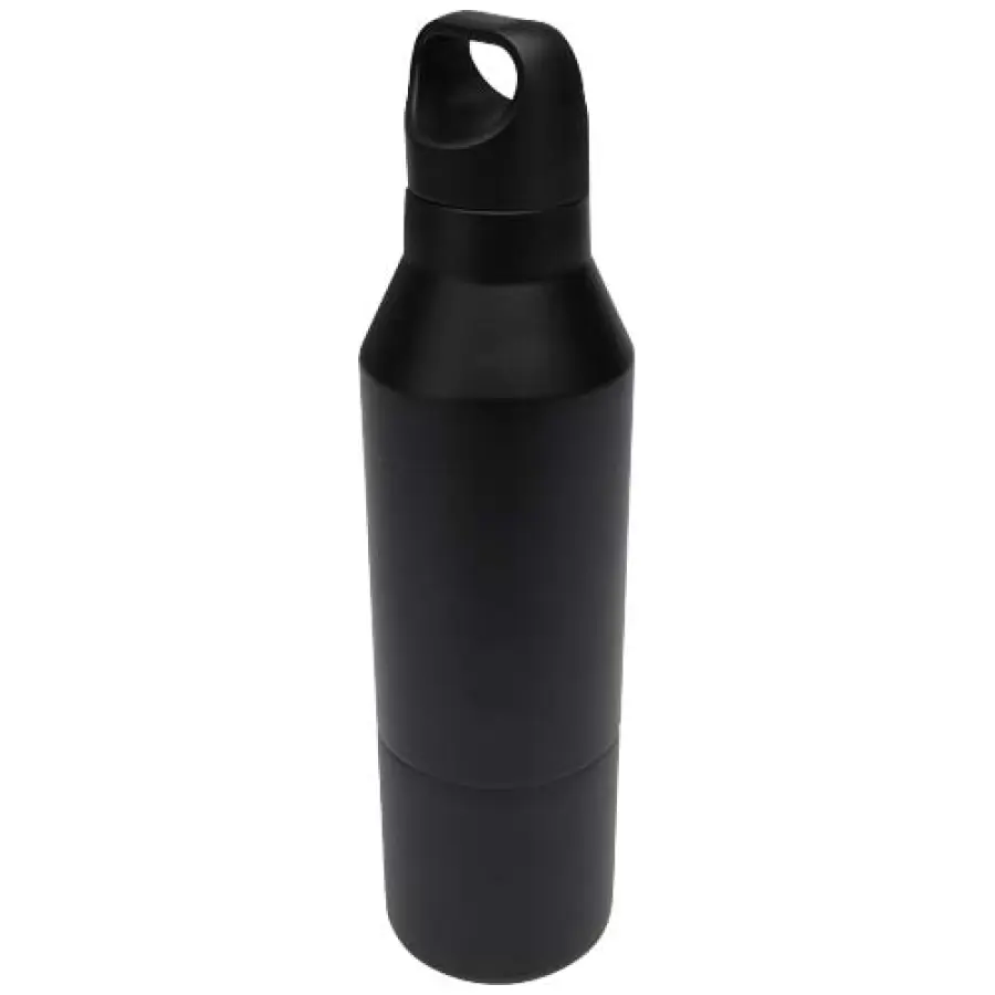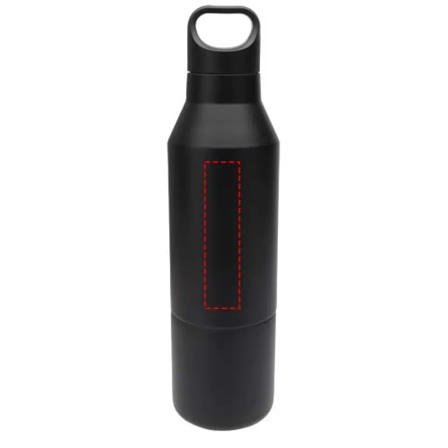 Izolowana butelka z podwójnymi ściankami ze stali nierdzewnej z powłoką miedzianą z certyfikatem RCS i zdejmowanym kubkiem. Ta wielofunkcyjna butelka została zaprojektowana tak, aby zmieścić się w bocznej kieszeni plecaka. Posiada wygodny uchwyt do przenoszenia zintegrowany z zakrętką. Trwała powłoka proszkowa na zewnątrz. Utrzymuje temperaturę napojów gorących do 12 godzin lub zimnych do 24 godzin. Zapakowana w pudełko upominkowe wykonane z kartonu z recyklingu. Pojemność butelki: 600 ml. Pojemność kubka: 300 ml.