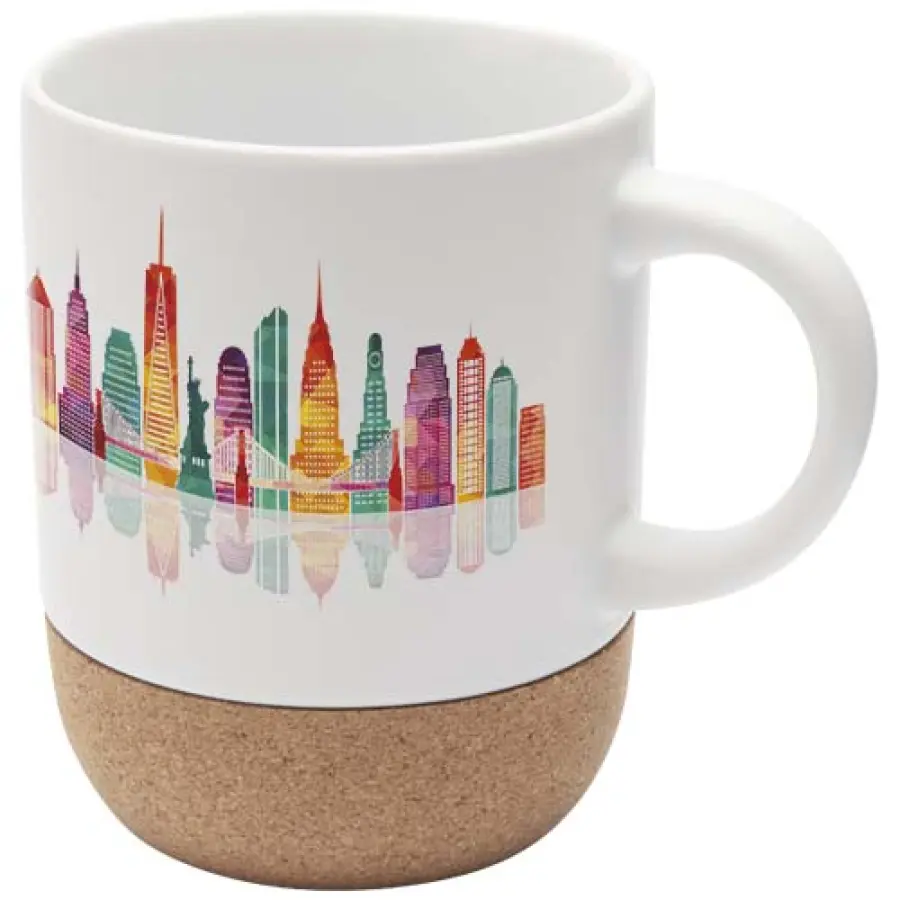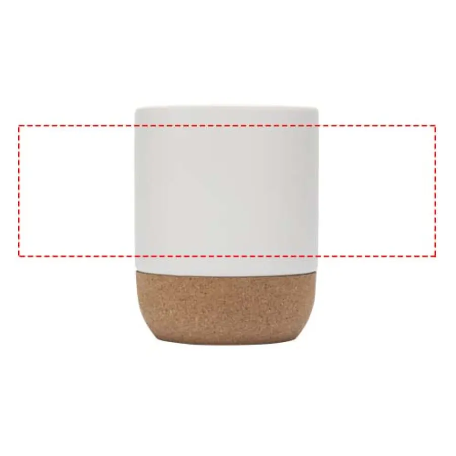 Ceramiczny kubek z korkowym detalem na spodzie i specjalną powłoką zewnętrzną umożliwiającą wykonywanie nadruków metodą sublimacji. Błyszczące wnętrze i błyszcząca powierzchnia zewnętrzna. Myć ręcznie w ciepłej wodzie z dodatkiem łagodnych detergentów. Zapakowana w pudełko upominkowe wykonane z kartonu z recyklingu. Pojemność: 300 ml.