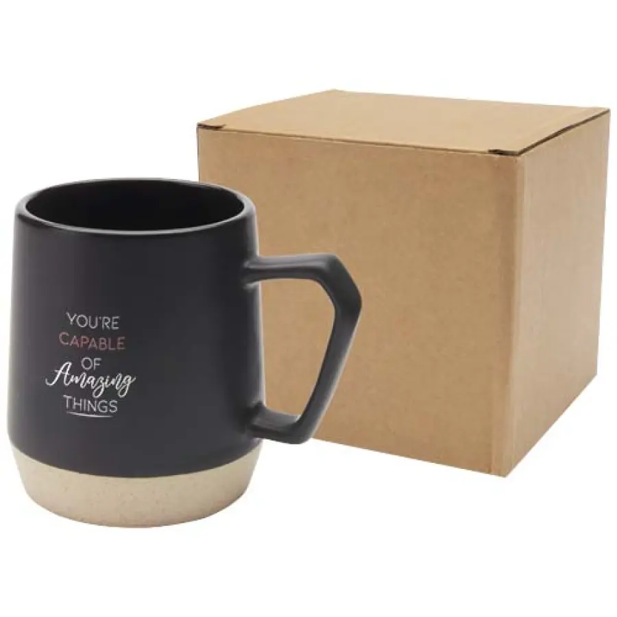 Stylowy ceramiczny kubek z nieszkliwionym dnem. Można myć w zmywarce. Zapakowana w pudełko upominkowe wykonane z kartonu z recyklingu. Pojemność: 300 ml.