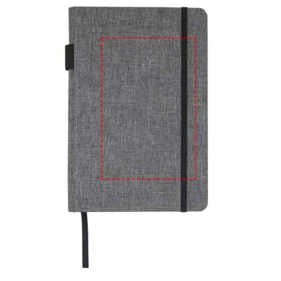 Notatnik w formacie A5 z okładką wykonaną z materiału RPET. Posiada 96 arkuszy w linie o gramaturze 70 g/m² z papieru z recyclingu, pętelkę na pióro i wstążkę. Pakowany w kartonowe opakowanie.