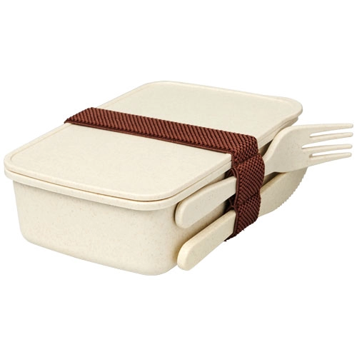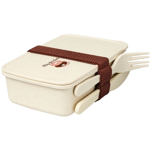 Lunchbox wykonany jest w 50% z włókna bambusowego i w 50% z tworzywa sztucznego PP. W zestawie znajduje się widelec, nóż oraz elastyczna opaska, dzięki której wszystkie elementy są razem. Bamboo fibre, Polipropylen.