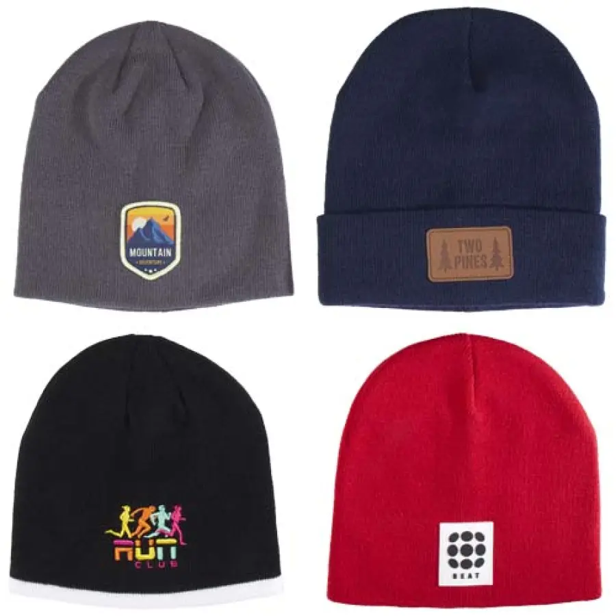 Pudełko z 3 czapkami beanie w różnych stylach: 1 dwuwarstwowa z mankietem, 1 dwuwarstwowa z lamówką i 1 dwuwarstwowa z 6 szwami.