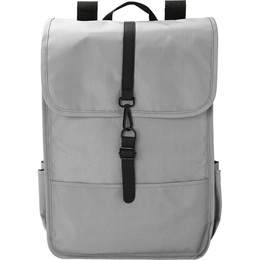 Plecak z klapą wykonany z RPET, dwie kieszenie boczne, przestronna przegroda główna, zamykany na klamrę