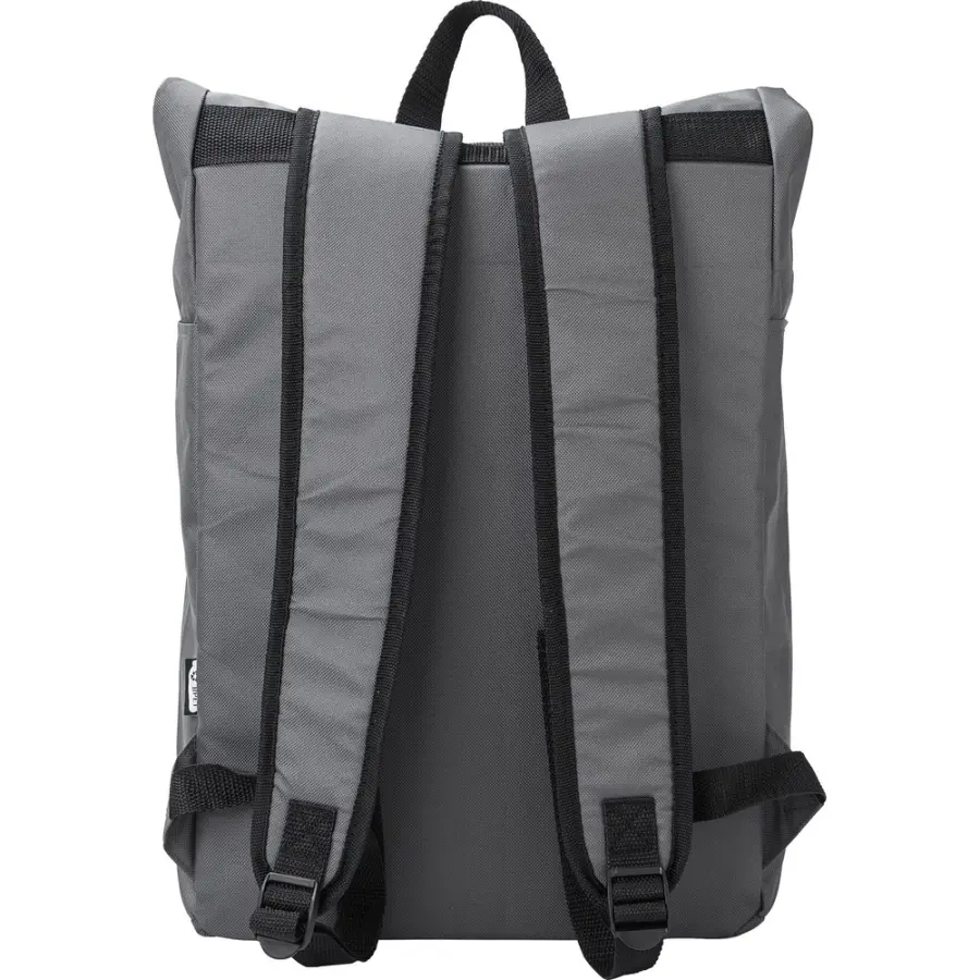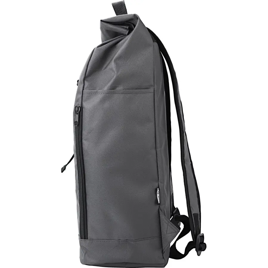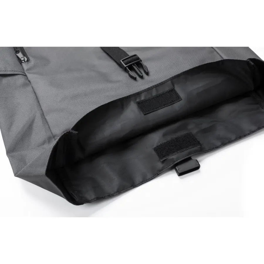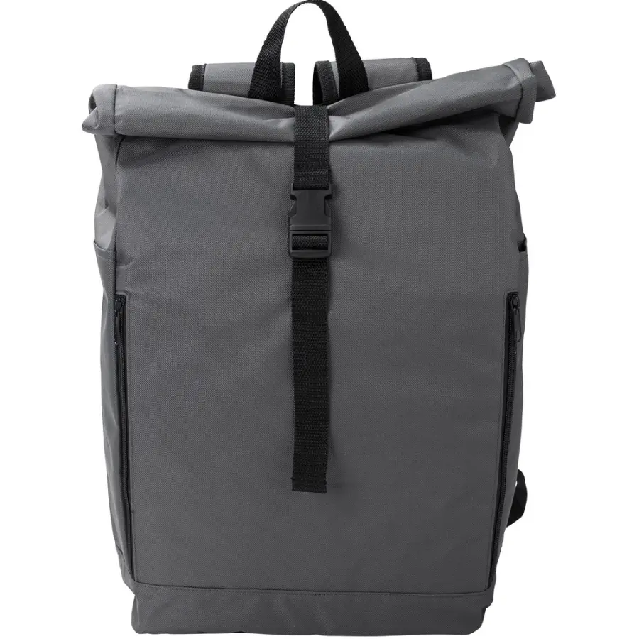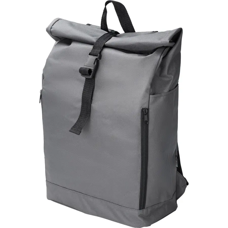 Plecak zawijany, wykonany z RPET, dwie kieszenie boczne zapinane na zamek, przestronna przegroda główna, zamykany na rzep i klamrę