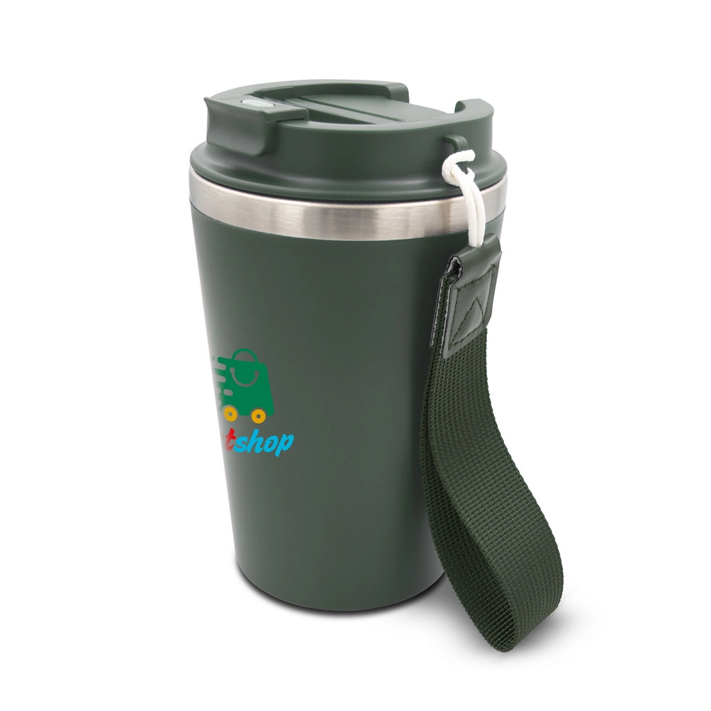 Kubek termiczny 350 ml, posiada podwójne ścianki ze stali nierdzewnej z recyklingu i plastiku, pasek ułatwiający noszenie lub przypięcie, produkt wykonany ze stali nierdzewnej z recyklingu i PP, utrzymuje temperaturę napojów gorących do 4 godzin +leakproof