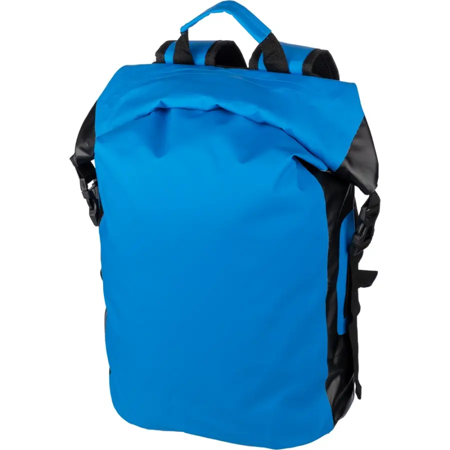 Plecak zwijany, wodoodporny, rozwijalna główna kieszeń zamykana na klamrę, która umożliwia zwiększanie pojemności plecaka oraz lepiej chroni przed czynnikami atmosferycznymi po zwinięciu, posiada regulowane, wzmocnione paski i wzmocniony spód, uchwyt ułatwiający noszenie, produkt wykonany między innymi z poliestru