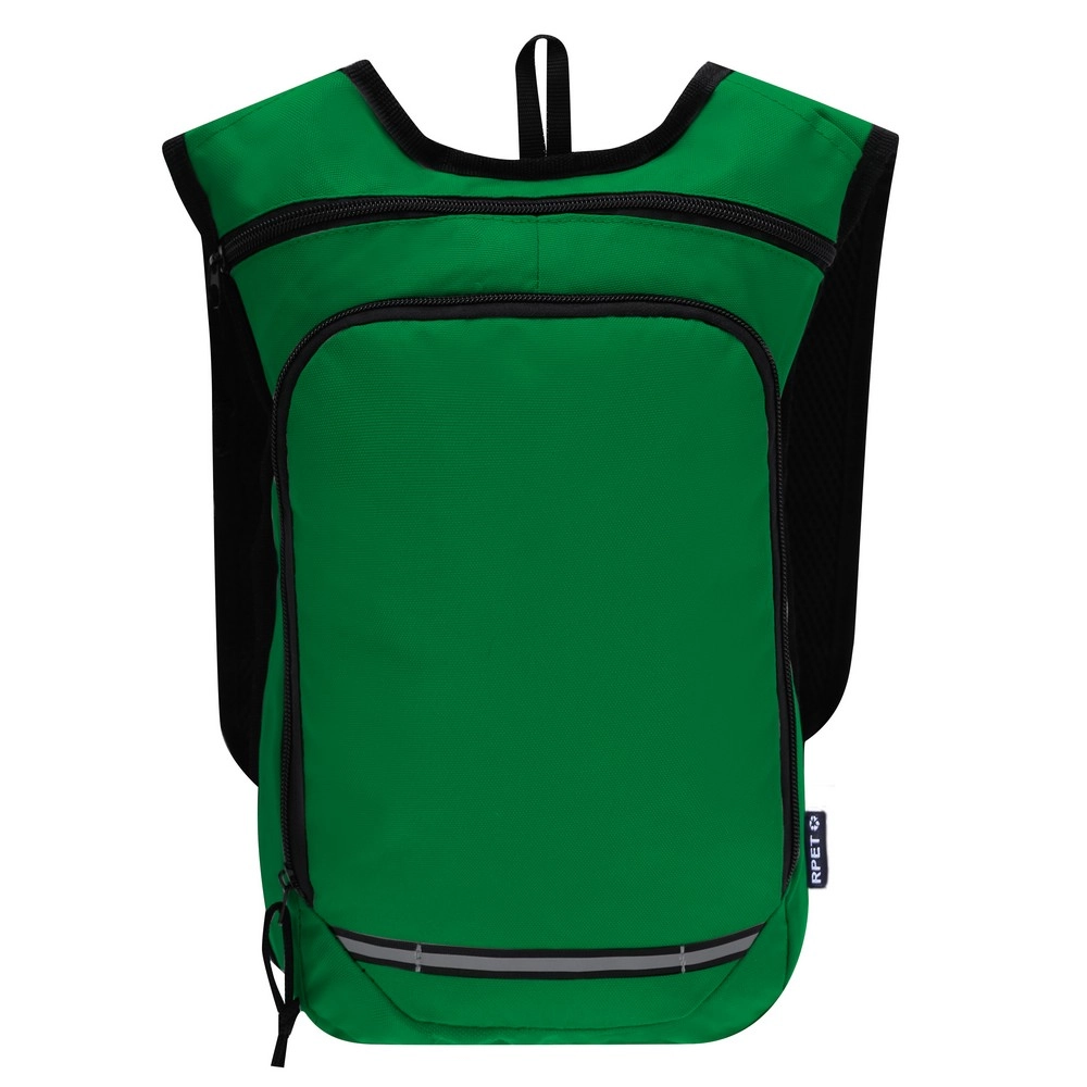 Plecak, miękki tył zwiększający komfort użytkowania i regulowane paski na ramię umożliwiające dopasowanie ich długości do własnych preferencji, na froncie połyskliwy pasek, produkt wykonany z poliestru 600D RPET. Wyłącznie do użytku promocyjnego.