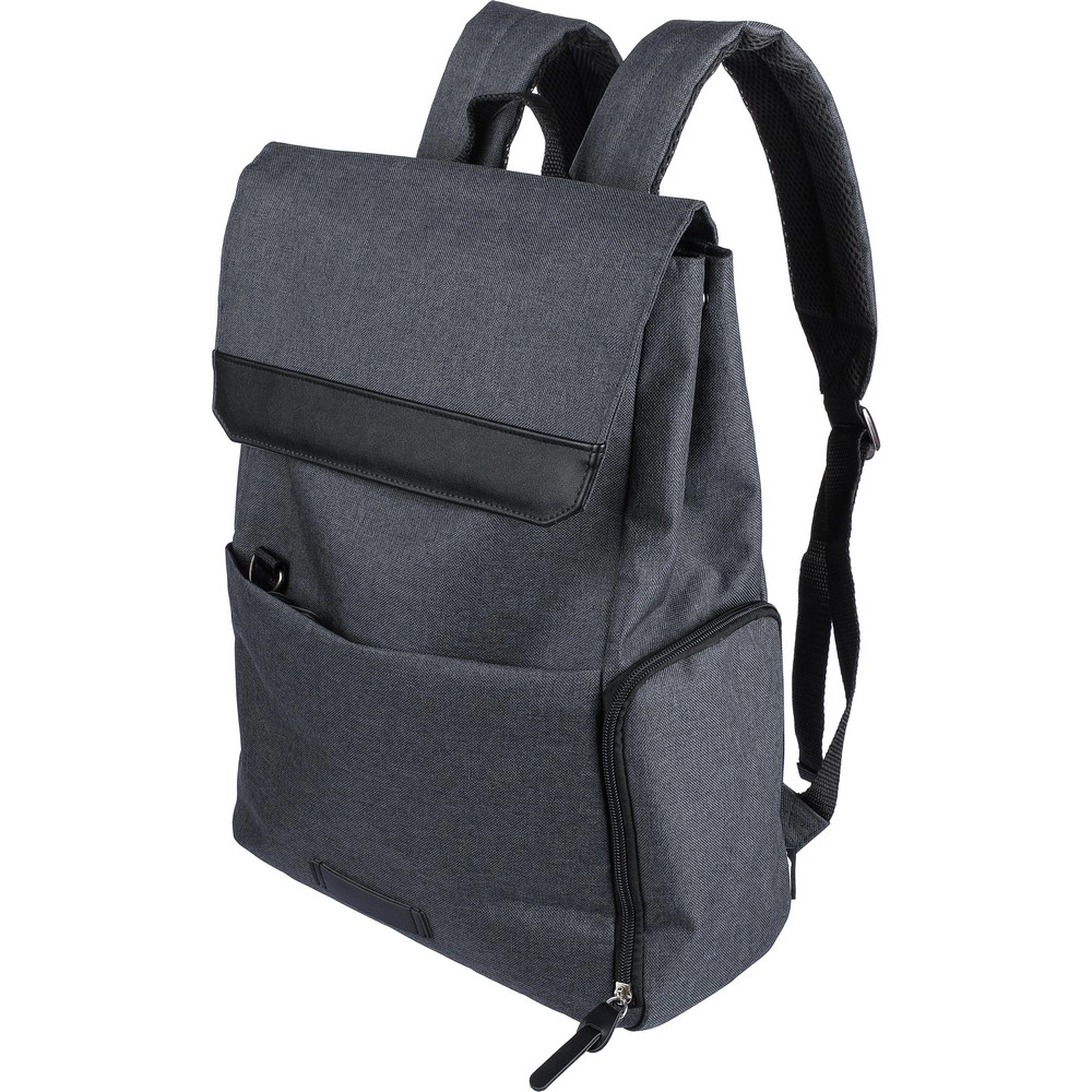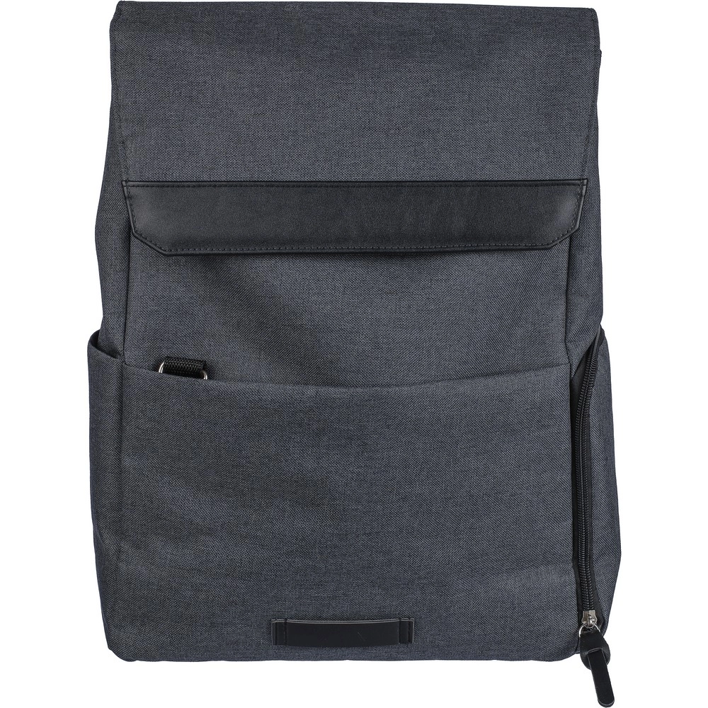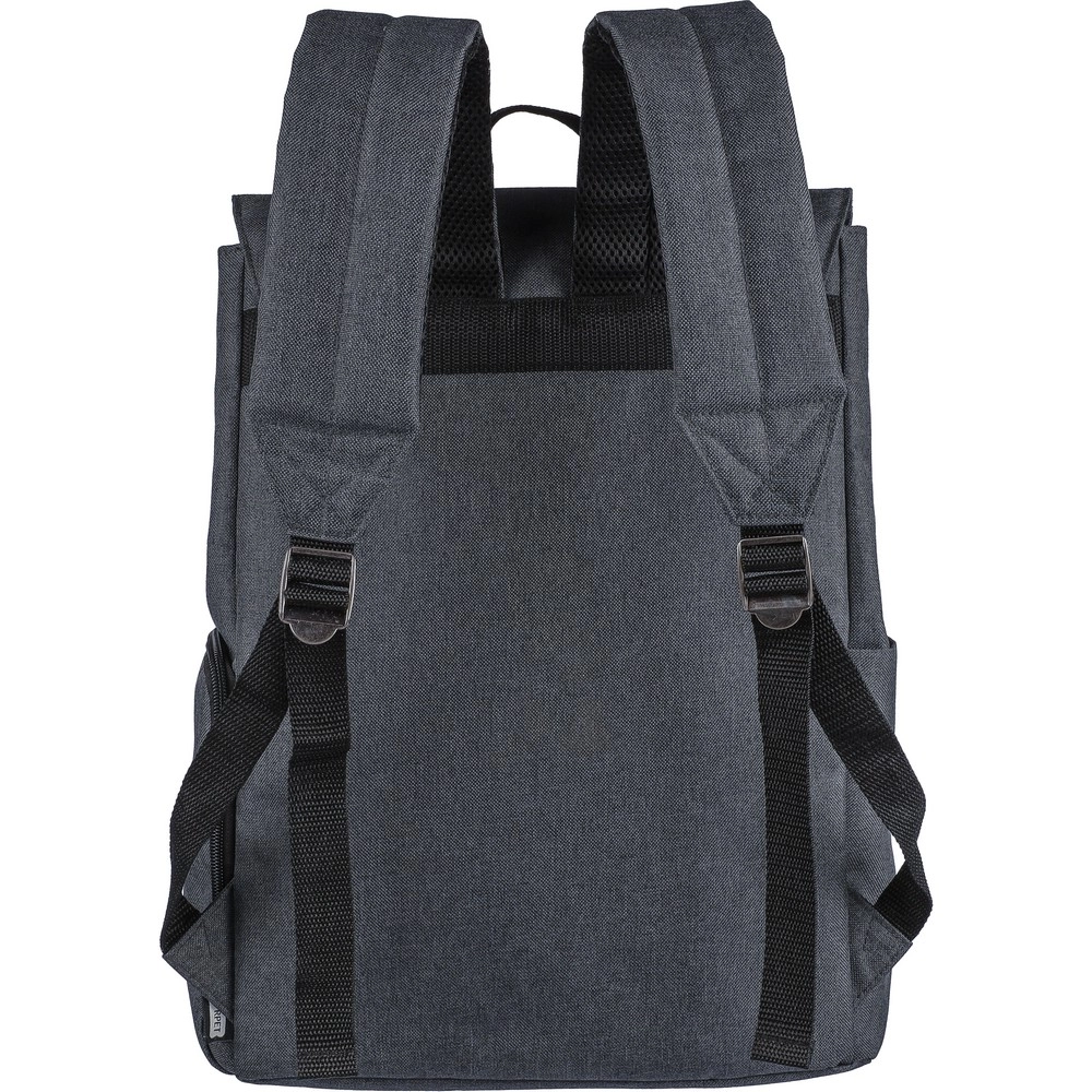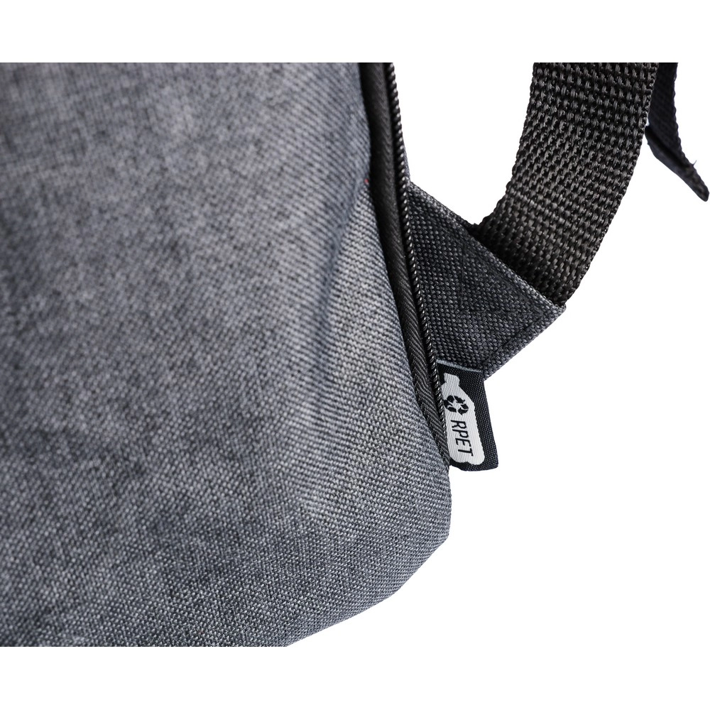 Plecak na laptopa 15" z podszewką, mała przednia kieszeń zapinana na zamek, komora zapinana na zamek z boku, zwykła kieszeń boczna, duża komora zamykana na magnes z kieszenią na laptopa, przyciski z boku umożliwiają zamknięcie plecaka, gdy nie jest on całkowicie wypełniony, regulowane paski, uchwyt na górze umożliwiający zawieszenie na wieszaku, ikona RPET na metce, wewnątrz zapinanej na zamek kieszeni z przodu znajduje się kółko i karabińczyk umożlwiający zapięcie kluczy i chroni je przed kradzieżą, produkt wykonany z płótna poliestrowego, poliester i PP