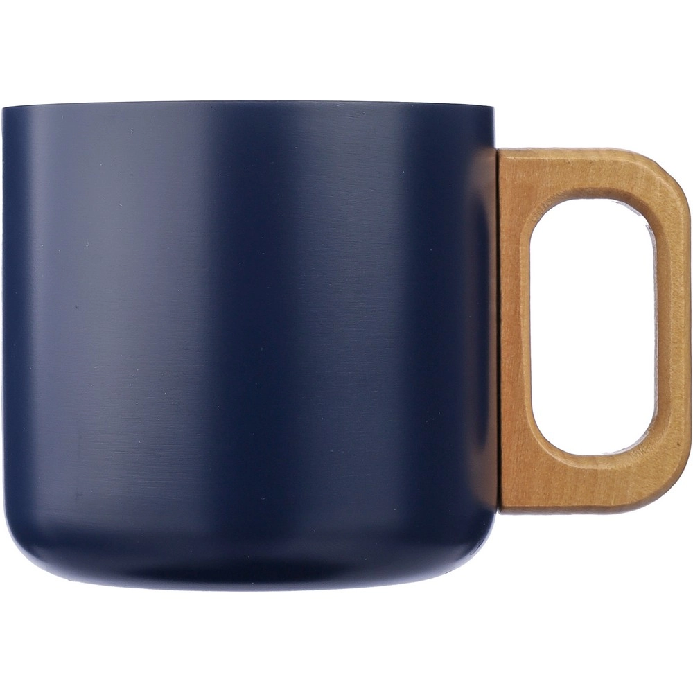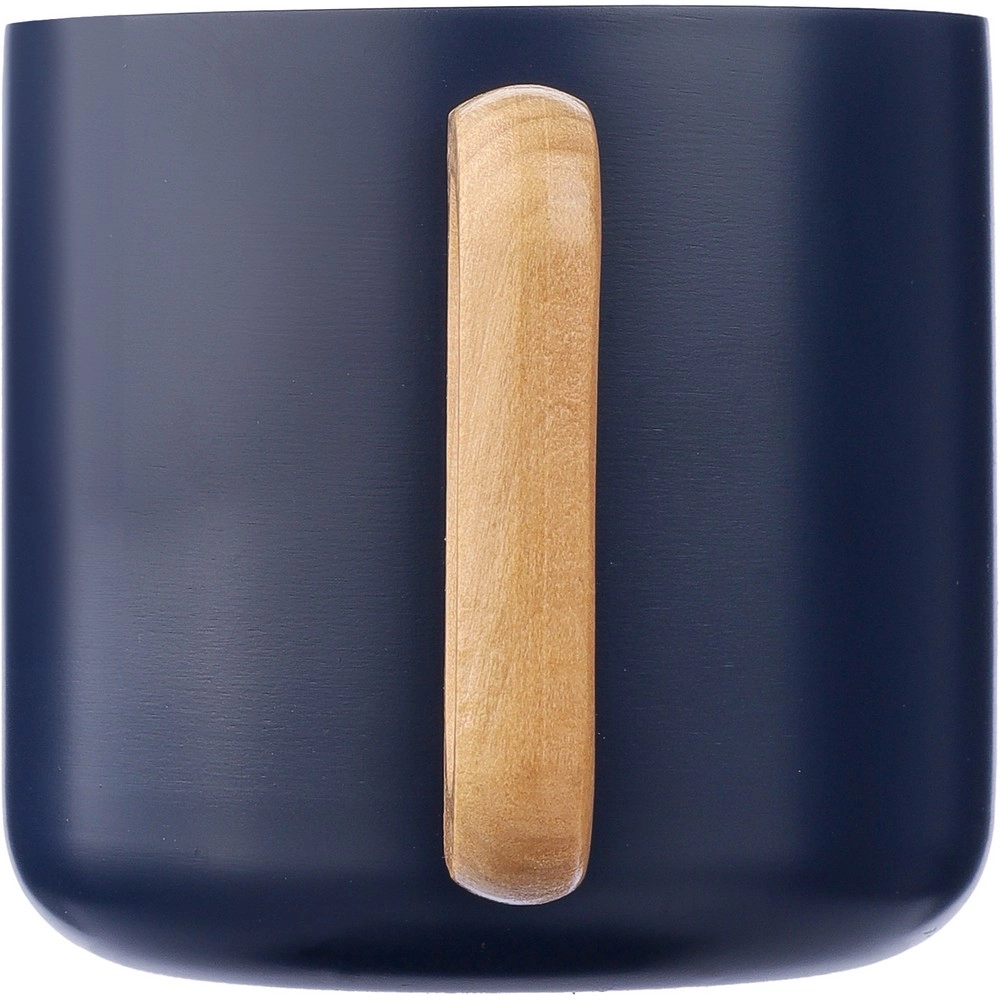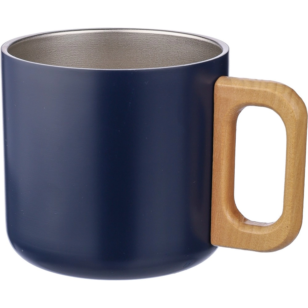 Kubek 400 ml posiada podwójne ścianki ze stali nierdzewnej z recyklingu, które chronią przed poparzeniem, solidny uchwyt z drewna, ikona stali nierdzewnej z recyklingu na produkcie, zapakowany w brązowy kartonik, produkt wykonany ze stali nierdzewnej