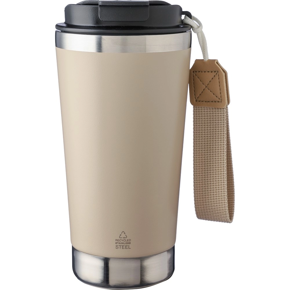 Kubek termiczny 500 ml posiada podwójne ścianki ze stali nierdzewnej z próżnią między ściankami, co spowalnia oddawanie temperatury na zewnątrz, zachowując funkcje termosu, pasek zwiększający wygodę użytkowania, ikona stali nierdzewnej z recyklingu na produkcie, zapakowana w brązowy kartonik, produkt wykonany ze stali nierdzewnej, silikonu, PP, PU, poliestru, utrzymuje temperaturę napojów gorących do 20 godzin +leakproof