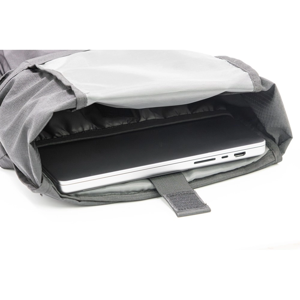 Plecak zwijany BrandCharger Venturer, wykonany z butelek PET pochodzących z recyklingu, elegancki wygląd, przestronna komora główna, kilka elastycznych kieszeni, wyściełana przegroda na laptopa 16", lekki i wyposażony w oszczędzający miejsce system rolek, sprawdzi się w codziennych dojazdach do pracy, podczas podróży lub krótkich wycieczek, wyposażony w odblaskowe sznuki, regulowany pasek na ramię, zwijane zapięcie, wentylowane paski na ramiona, wodoodporny i odporny na plamy materiał, produkt wykonany z RPET i poliestru