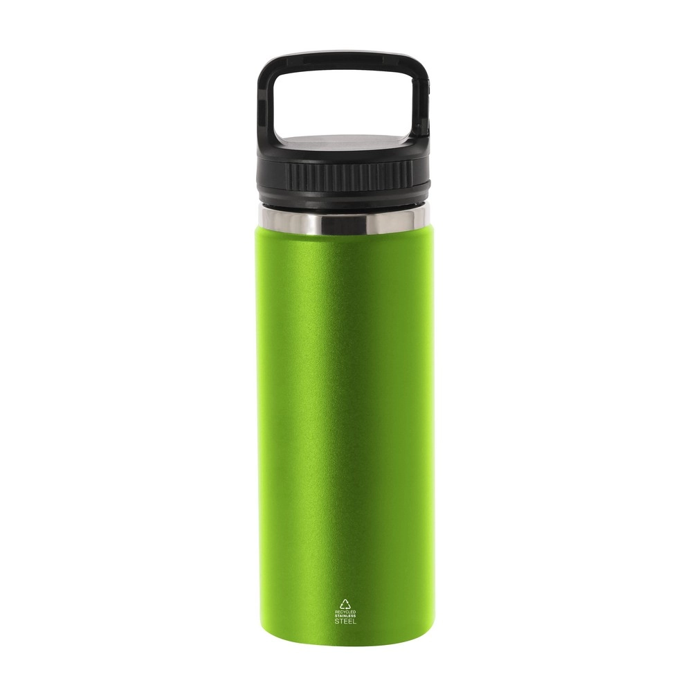 Butelka termiczna 550 ml z karabińczykiem umożliwiającym przypinanie, posiada podwójne ścianki, które spowalniają oddawanie temperatury na zewnątrz, produkt wykonany ze stali nierdzewnej z recyklingu