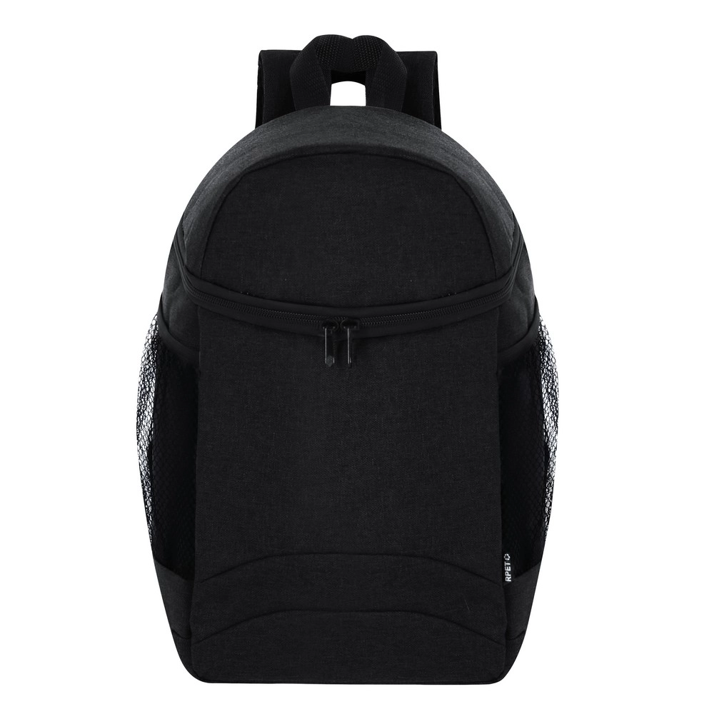 Plecak termoizolacyjny, wyposażony w wyściełane paski na ramiona dla komfortu noszenia, posiada dwie kieszenie z siateczki oraz główną komorę zapinaną na zamek błyskawiczny, produkt wykonany z poliestru 600D RPET i PEVA