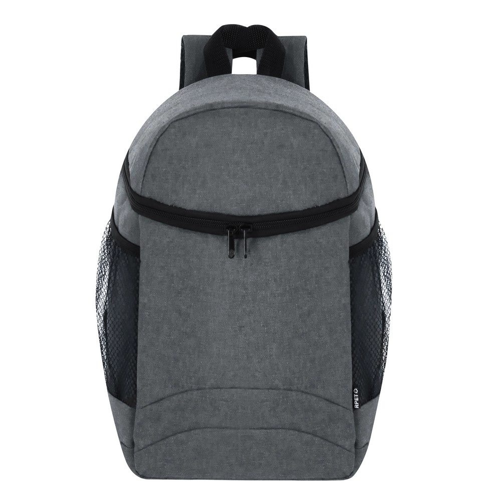 Plecak termoizolacyjny, wyposażony w wyściełane paski na ramiona dla komfortu noszenia, posiada dwie kieszenie z siateczki oraz główną komorę zapinaną na zamek błyskawiczny, produkt wykonany z poliestru 600D RPET i PEVA