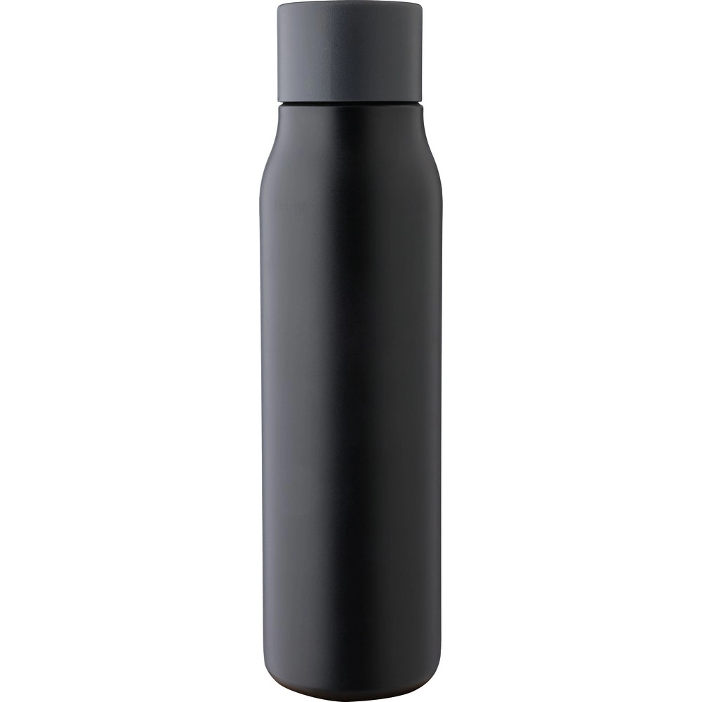 Butelka termiczna 600 ml, uchwyt ułatwiający przenoszenie, utrzymuje temperaturę napojów – ciepłych do 6 godzin, zimnych do 9 godzin, na przedniej części ikona aluminium z recyklingu na produkcie, pakowana pojedynczo w brązowe kartonowe pudełko, wnętrze wykonane ze stali nierdzewnej 304, zewnętrzna warstwa ze stali nierdzewnej 201,szczelna czarna nakrętka z PP, aluminiowy karabińczyk
