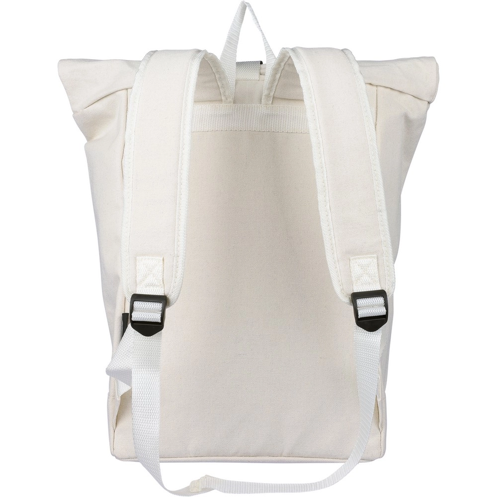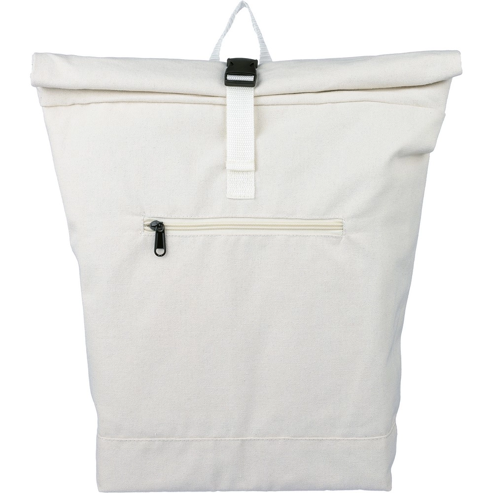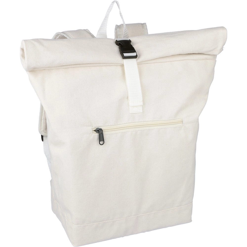 Zwijany plecak, pojemność 15L, duża komora zapinana na zamek z przegrodą na laptopa 15", dwie wewnętrzne kieszenie, jedna zewnętrzna kieszeń, konstrukcja obejmuje uchwyt do przenoszenia na górze, wyściełane regulowane szelki, mała przednia kieszeń na zamek, maksymalne obciążenie: 14 kg, produkt wykonany polibawełny z recyklingu (330 g/m²), podszewka z poliestru 210D, plastikowe zapięcie na klamrę