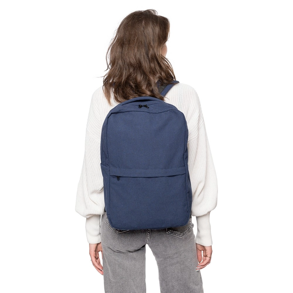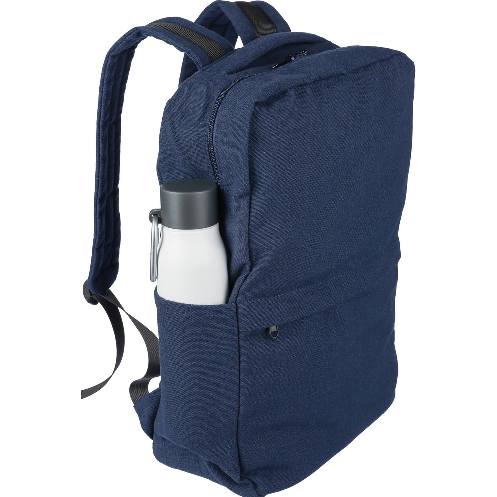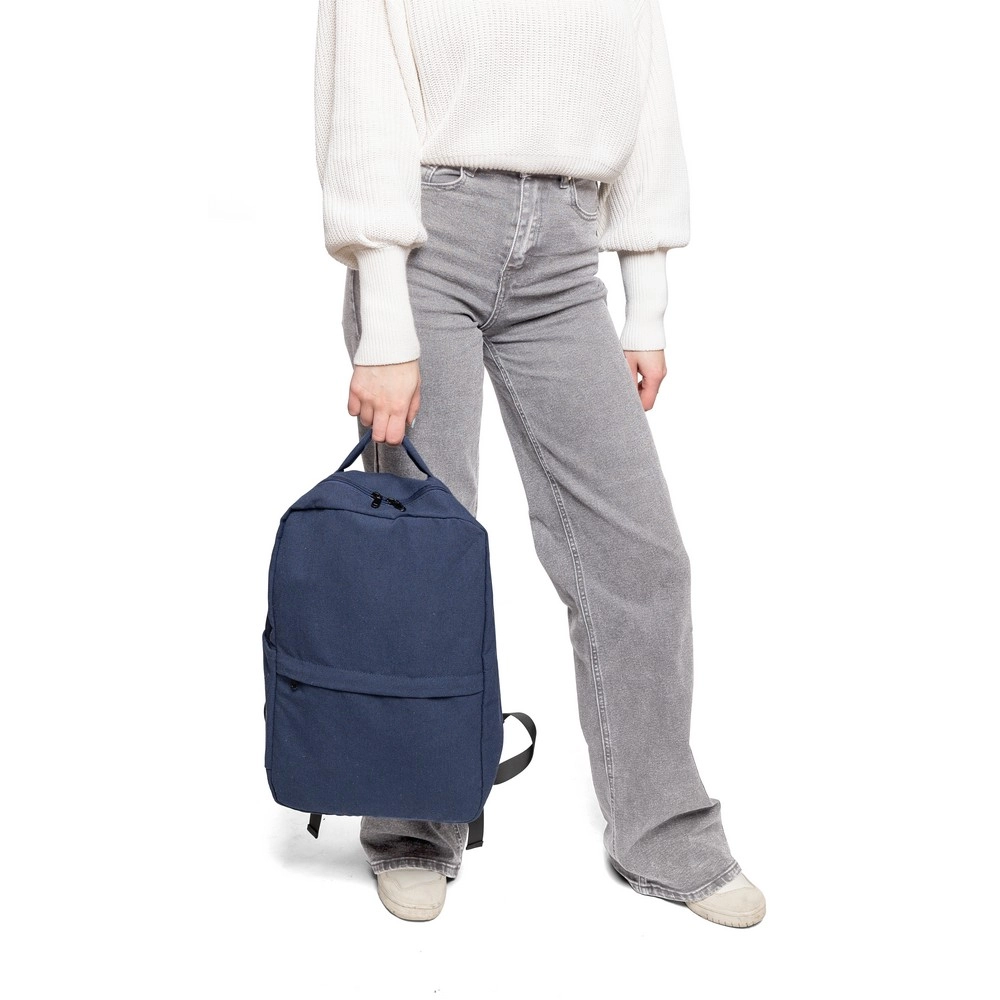 Plecak na laptopa 15", posiada dużą komorę zapinaną na zamek z wyściełaną przegrodą na laptop 15 cali, dwie kieszenie wewnętrzne oraz dwie kieszenie zewnętrzne, w tym boczną kieszeń i małą przednią kieszeń na zamek, konstrukcja obejmuje wyściełane, regulowane szelki oraz uchwyt do przenoszenia, pojemność: 14L, maksymalne obciążenie: 13 kg, produkt wykonany polibawełny z recyklingu (330 g/m²), podszewka z poliestru 210D