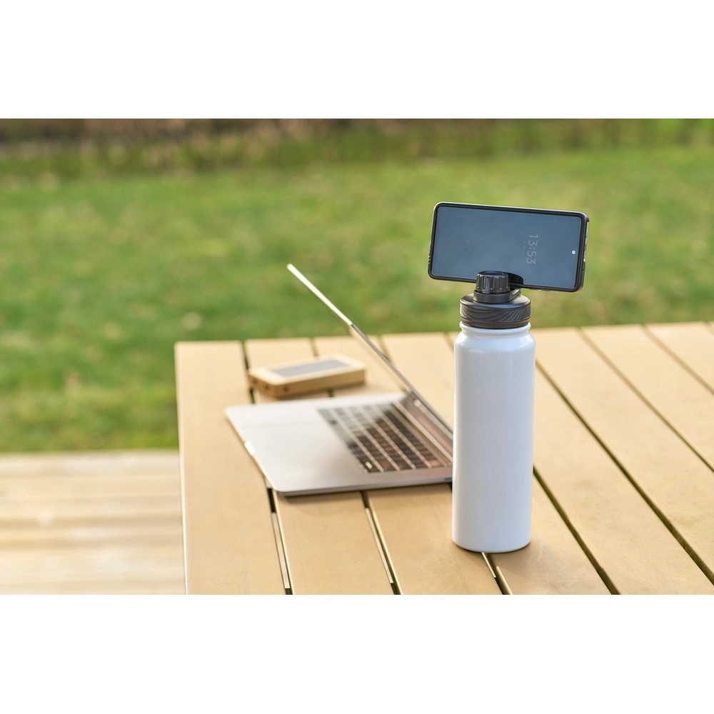 Butelka termiczna 800 ml, posiada podwójne ścianki, które spowalniają oddawanie temperatury na zewnątrz, nakrętka posiada uchwyt do przenoszenia, który pełni również funkcję mocnego magnetycznego stojaka na telefon, nie nadaje się do mycia w zmywarce, indywidualnie pakowana w brązowe kartonowe pudełko, wnętrze wykonane ze stali nierdzewnej 304, a zewnętrzna warstwa ze stali nierdzewnej 20, wyposażona w zakręcane wieczko z PP